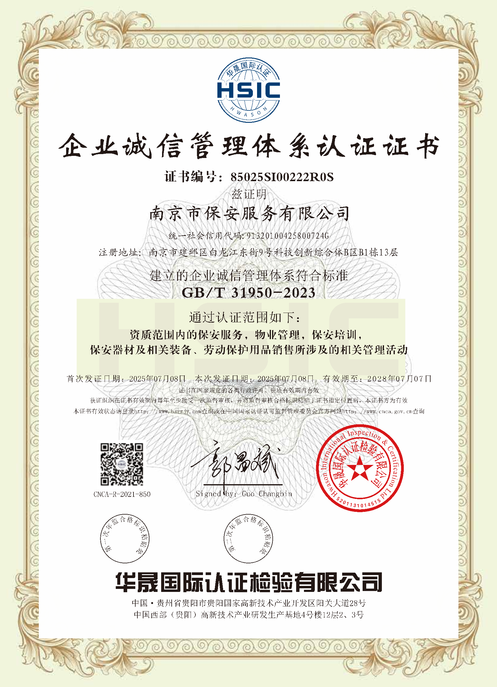 南京市保安服務有限公司(原南京市保安服務總公司)成立于1987年4月,是一個有著悠久安保經營歷史和安保經驗沉淀的大型國有保安企業,現為中國保安協會常務理事單位,江蘇省保安協會常務理事單位,南京市保安協會副會長單位,江蘇省一級保安服務公司。